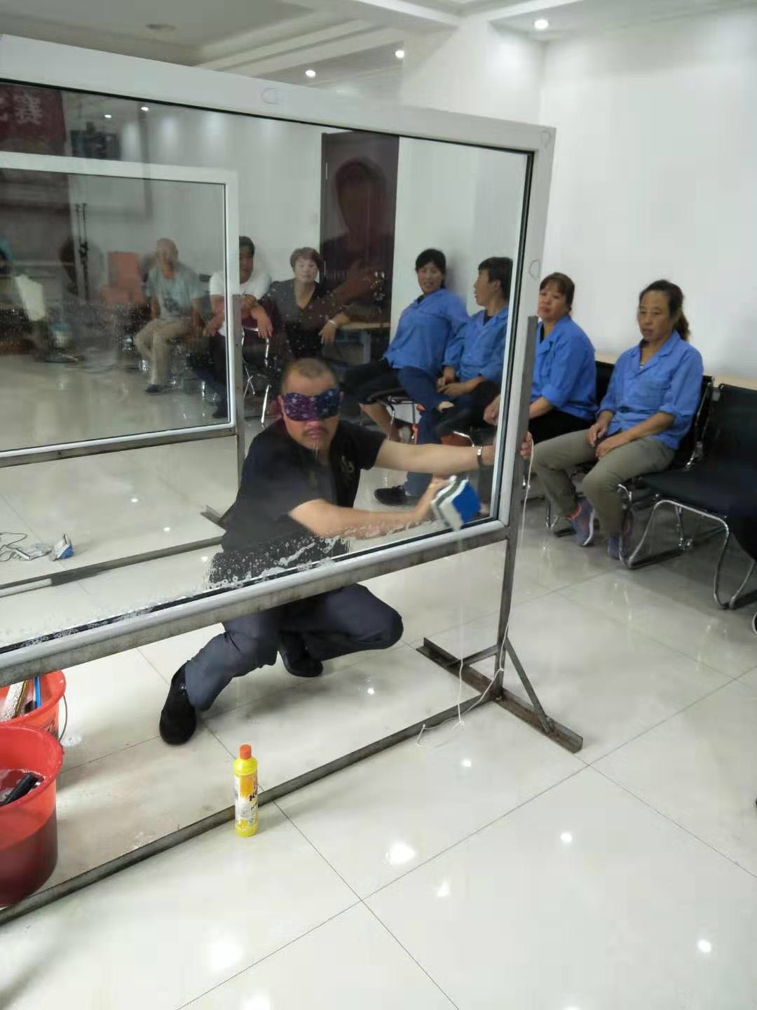 賽前,公司總經(jīng)理程晉軍、工會主席崔偉作了致辭動員。比賽選手個個摩拳擦掌,躍躍欲試。首先進行的是洗地機障礙演示技能比賽,比賽過程中每個選手都能嫻熟地安全避過比賽設(shè)置的障礙并能按正規(guī)操作章程進行,展示了過硬的操作技能;在高空外墻清洗安全防范實際演示過程中,穿工衣、帶安全帽、系安全繩以及放繩整個過程細致到位,一氣呵成;接著大家期盼的蒙眼擦玻璃賽將技能比賽推向了高潮,這是最富觀賞性的比賽,大家在佩服選手熟練的手法和技巧時,也對工程部對于服務(wù)質(zhì)量和技術(shù)的高要求感到敬佩。比賽中洋溢著歡歌笑語,公司副總經(jīng)理張永智對比賽進行了實時精彩的點評。
