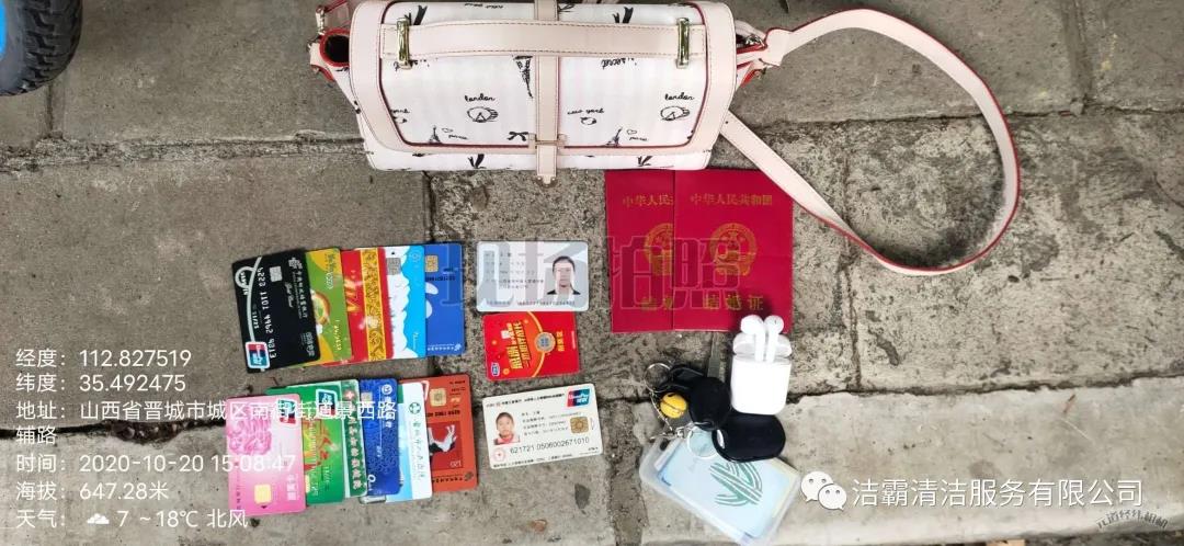 10月20日下午3點左右,晉城市潔霸清潔服務股份有限公司保潔部環(huán)衛(wèi)經(jīng)理李通和工人在城區(qū)南街街道景西路段進行街道清洗作業(yè)時,忽然看見晉城農(nóng)商銀行門前的綠化帶里有一個女士挎包,忙叫環(huán)衛(wèi)工人郭志云把挎包撿了起來。當時就考慮到失主丟失挎包以后一定很著急,在同事的共同見證下他們打開挎包,經(jīng)過查看,發(fā)現(xiàn)挎包內(nèi)有一張王女士的身份證、社保卡及銀行卡數(shù)張,還有結(jié)婚證、鑰匙、耳機、富士康工牌等物品。憑借富士康工牌上的工號,他們給富士康打電話聯(lián)系到了失主,后由環(huán)衛(wèi)主管秦彩鳳將挎包交到失主手中。收到失而復得的挎包,王女士又驚又喜,感激萬分。