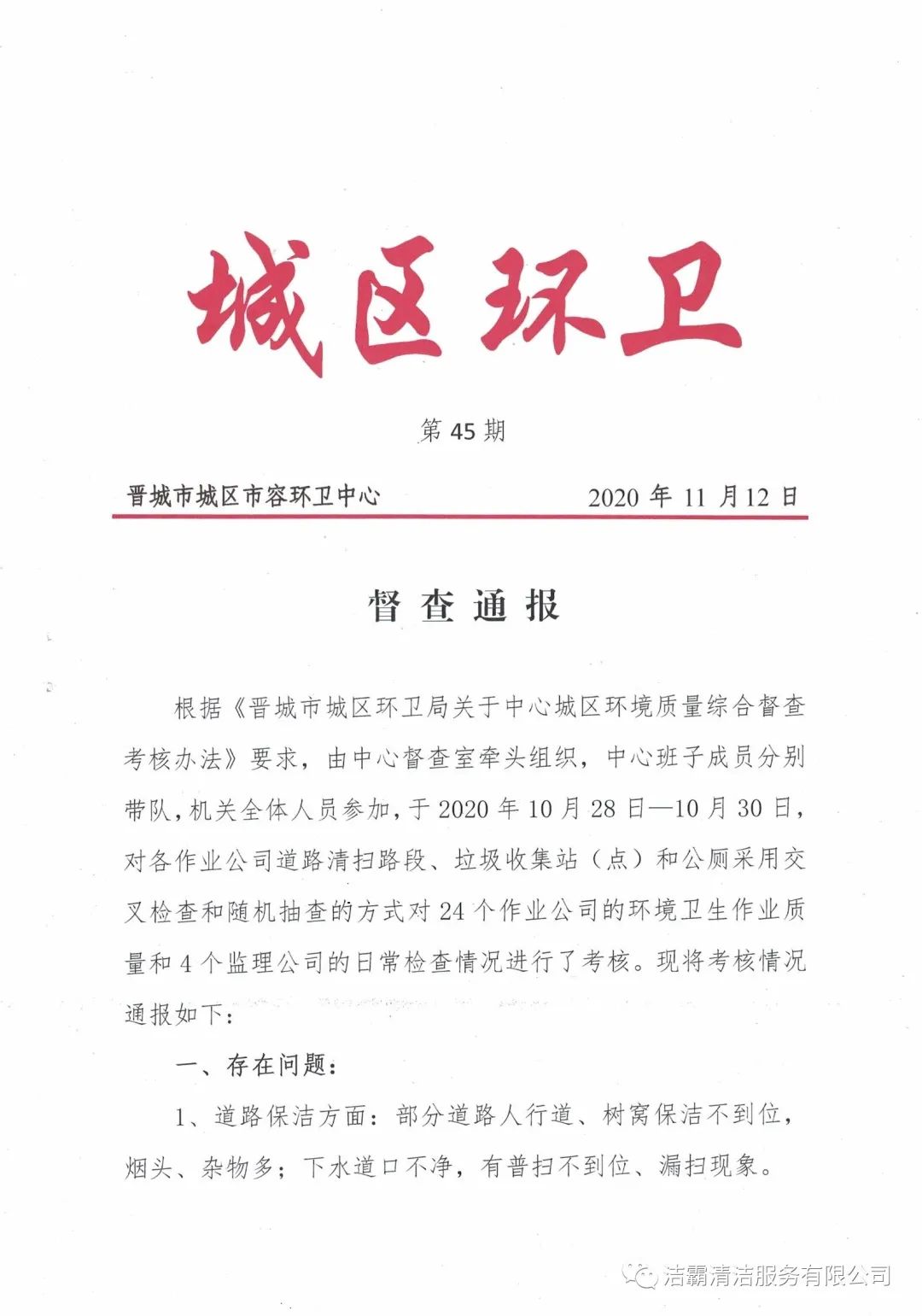 2020年10月28日—10月30日,晉城市城區(qū)市容環(huán)衛(wèi)中心由中心督查室牽頭組織,中心班子成員分別帶隊(duì),機(jī)關(guān)全體人員參加,對各作業(yè)公司道路清掃路段、垃圾收集站(點(diǎn))和公廁采用交叉檢查和隨機(jī)抽查的方式對24個(gè)作業(yè)公司的環(huán)境衛(wèi)生作業(yè)質(zhì)量和4個(gè)監(jiān)理公司的日常檢查情況進(jìn)行了考核。晉城市潔霸清潔服務(wù)股份有限公司所屬的環(huán)衛(wèi)四公司分?jǐn)?shù)最高,名列第一。
