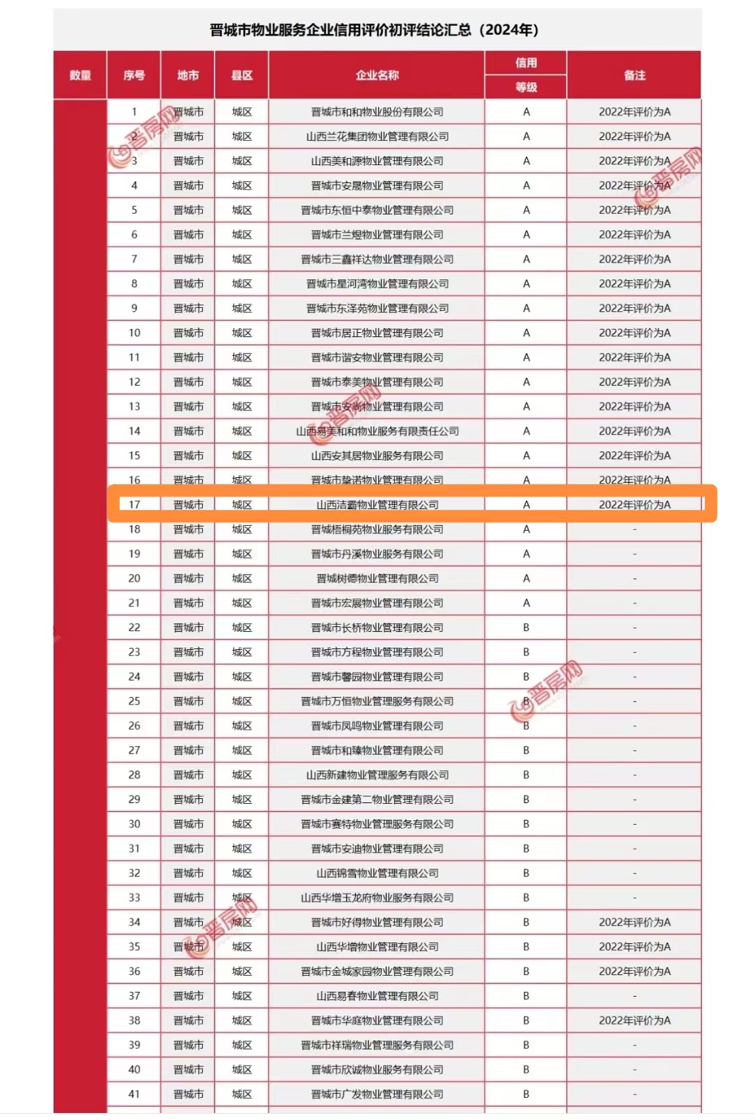 日前,山西省住房和城鄉(xiāng)建設(shè)廳發(fā)布了2023年度房地產(chǎn)企業(yè)信用評價結(jié)果的通知,根據(jù)通知顯示,晉城市共有200家物業(yè)服務(wù)公司參加評定,晉城市潔霸物業(yè)管理有限公司獲得2023年度物業(yè)服務(wù)企業(yè)信用等級A級認(rèn)證。在本次考評結(jié)果中,潔霸物業(yè)光榮上榜,是對其物業(yè)服務(wù)品質(zhì)的充分肯定。 |
